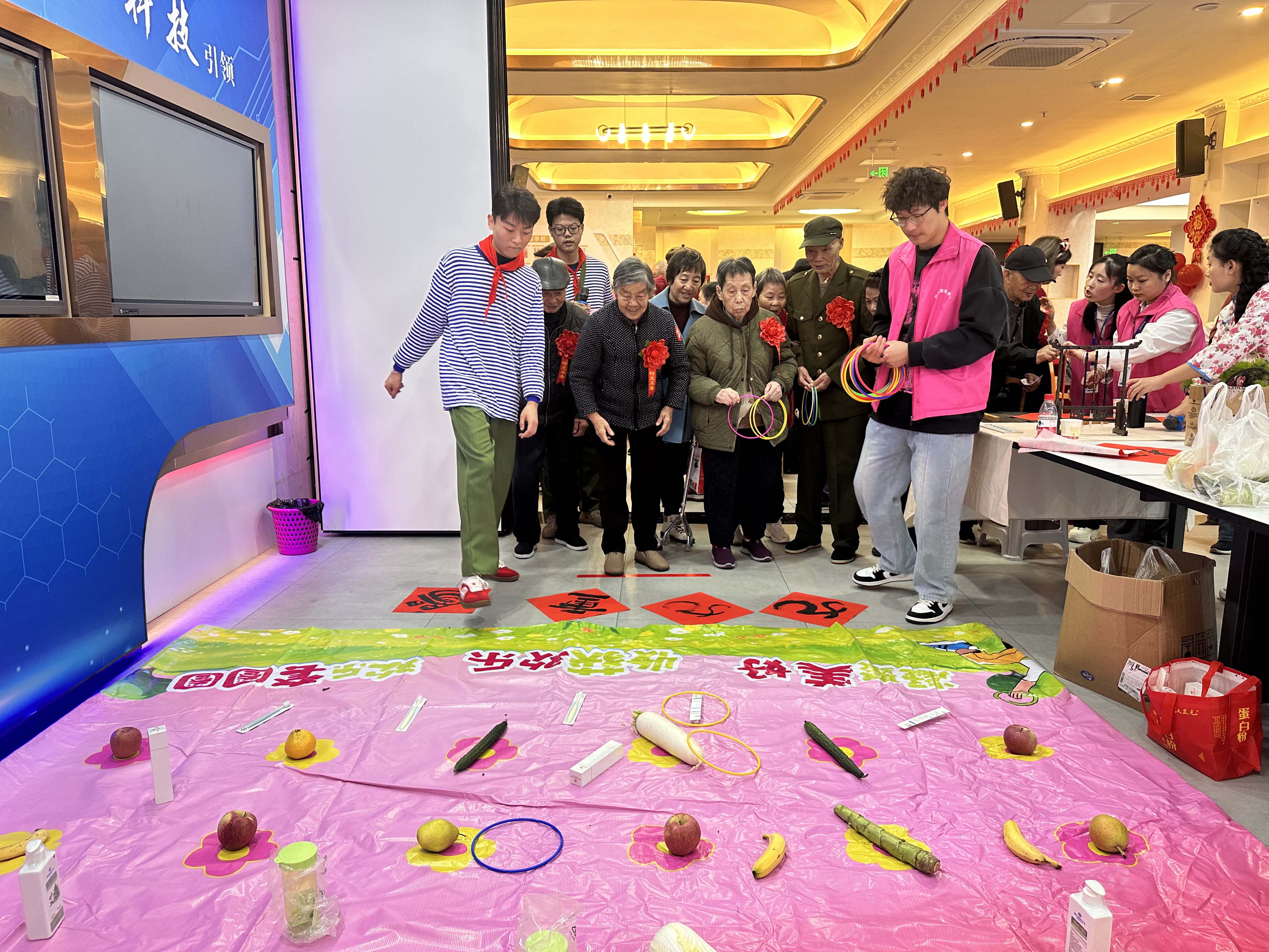 游园会区域同样热闹非凡。“欢乐套圈圈”前排起小队,长辈们踮脚瞄准心仪的水杯、牙膏和水果,投掷之间,有套中的兴奋拍手,也有未中的笑语“再来一次”,工作人员始终在旁微笑递圈,温情满满。