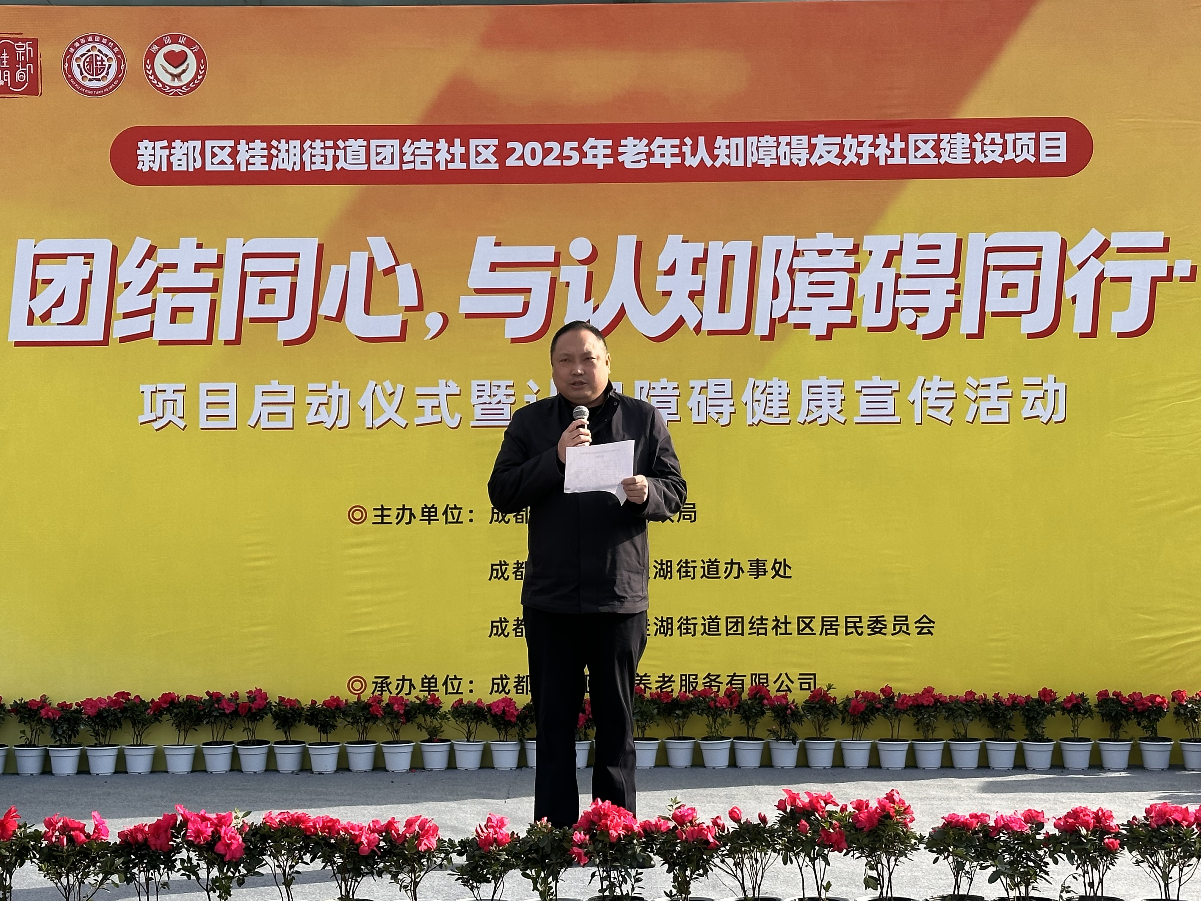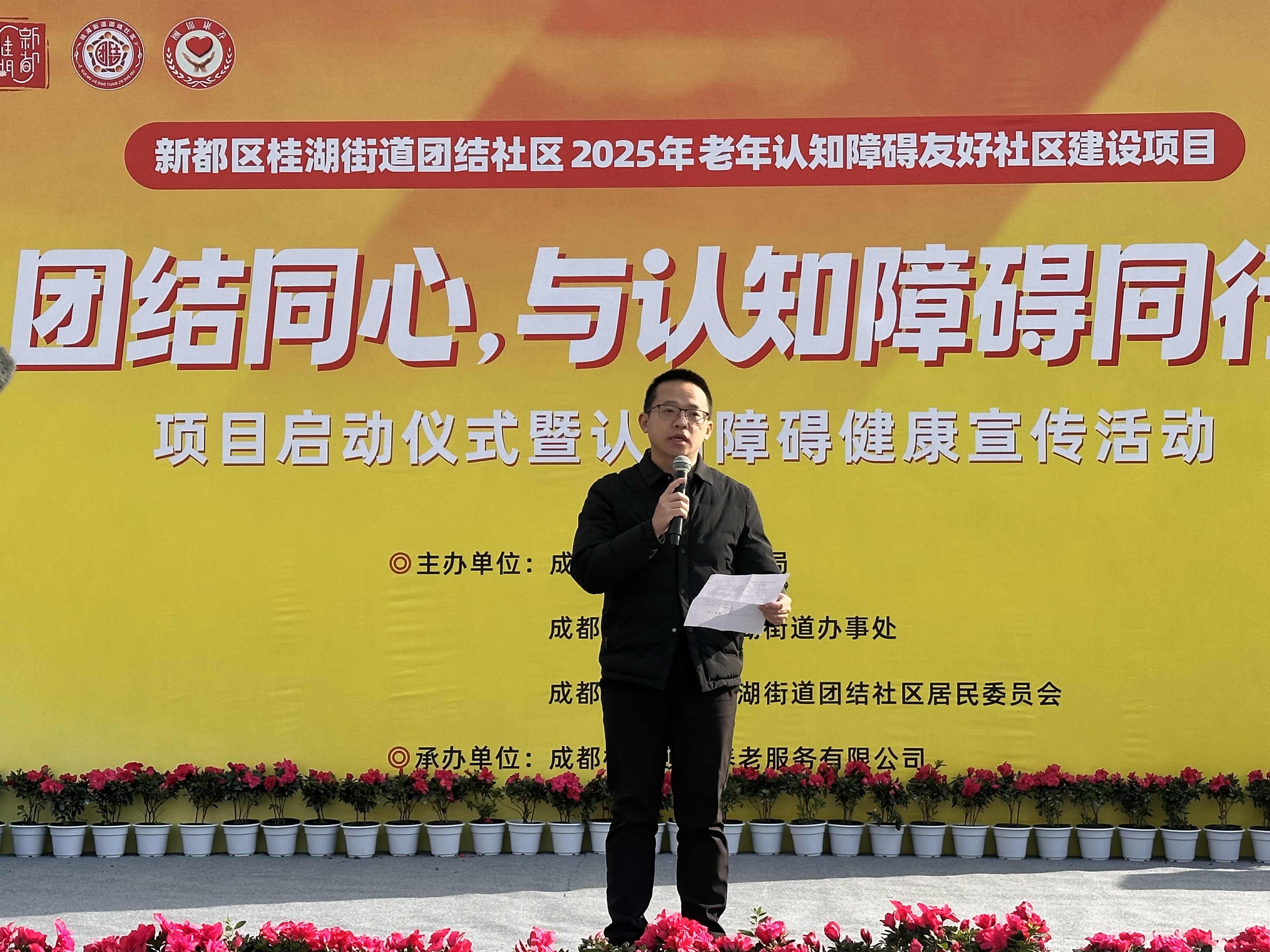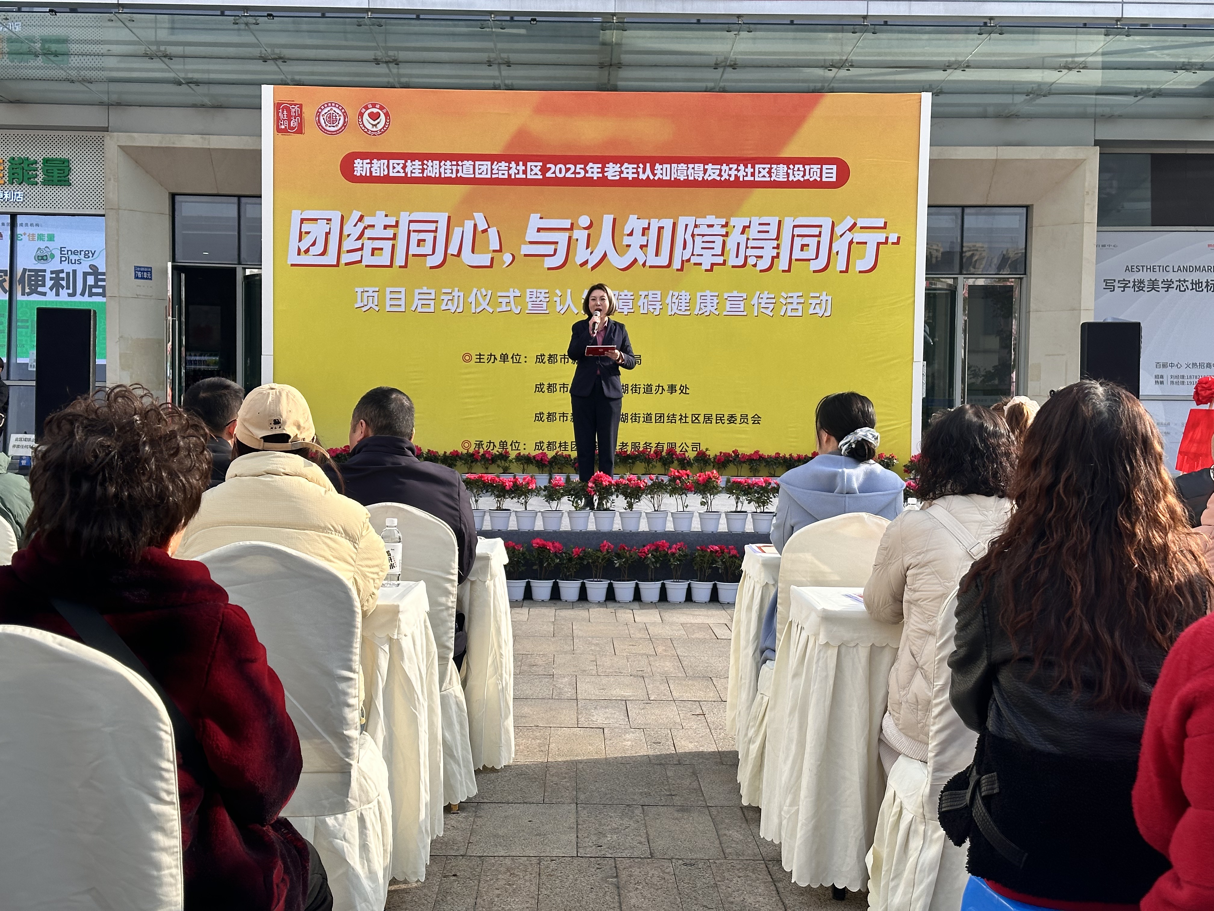 2025年11月19日上午,由新都区民政局、桂湖街道办事处及团结社区居民委员会联合主办,成都桂团颐锦养老服务有限公司承办的“团结同心,与认知障碍同行”项目启动仪式暨健康宣传活动在百郦中心顺利举行。