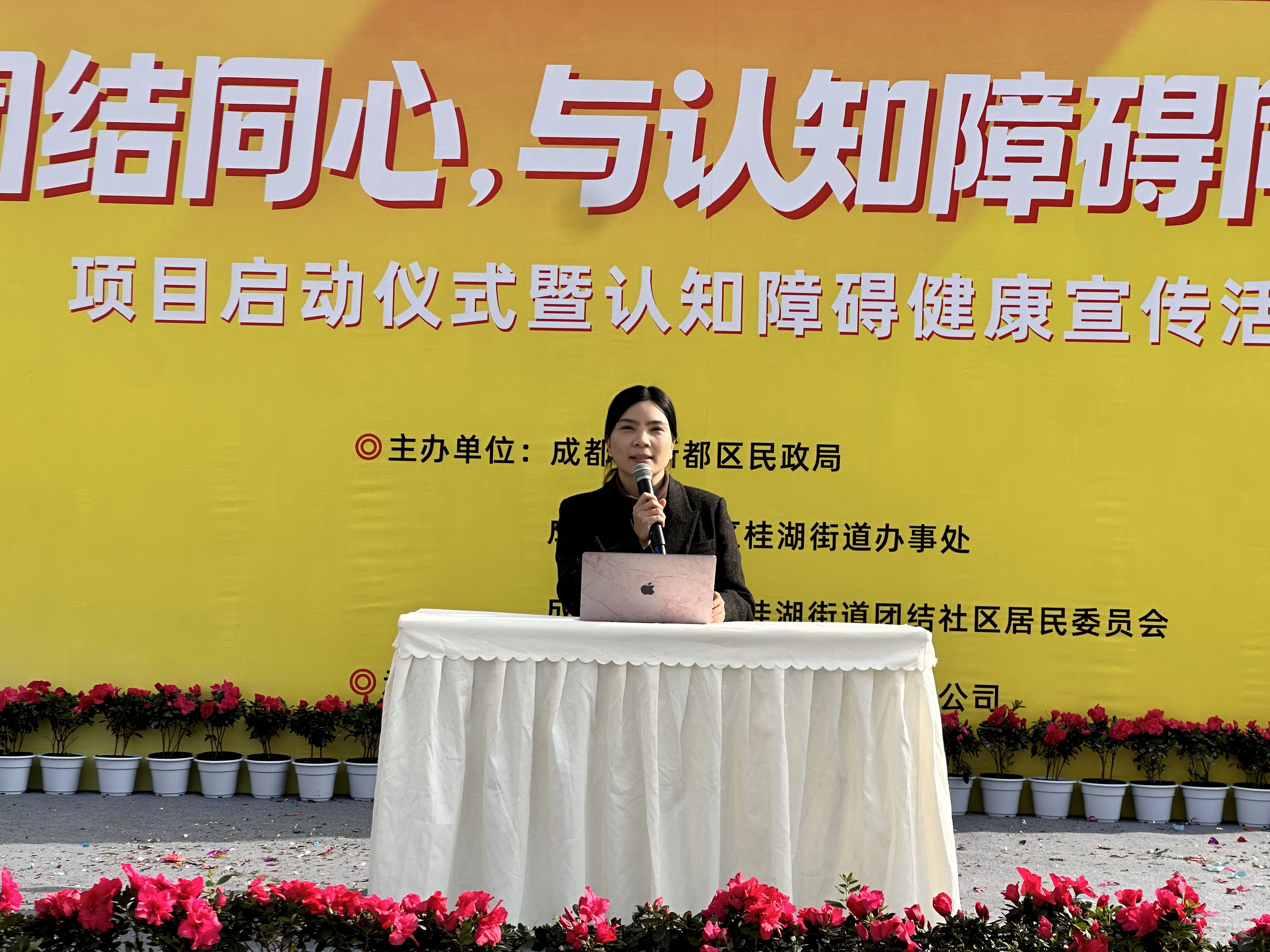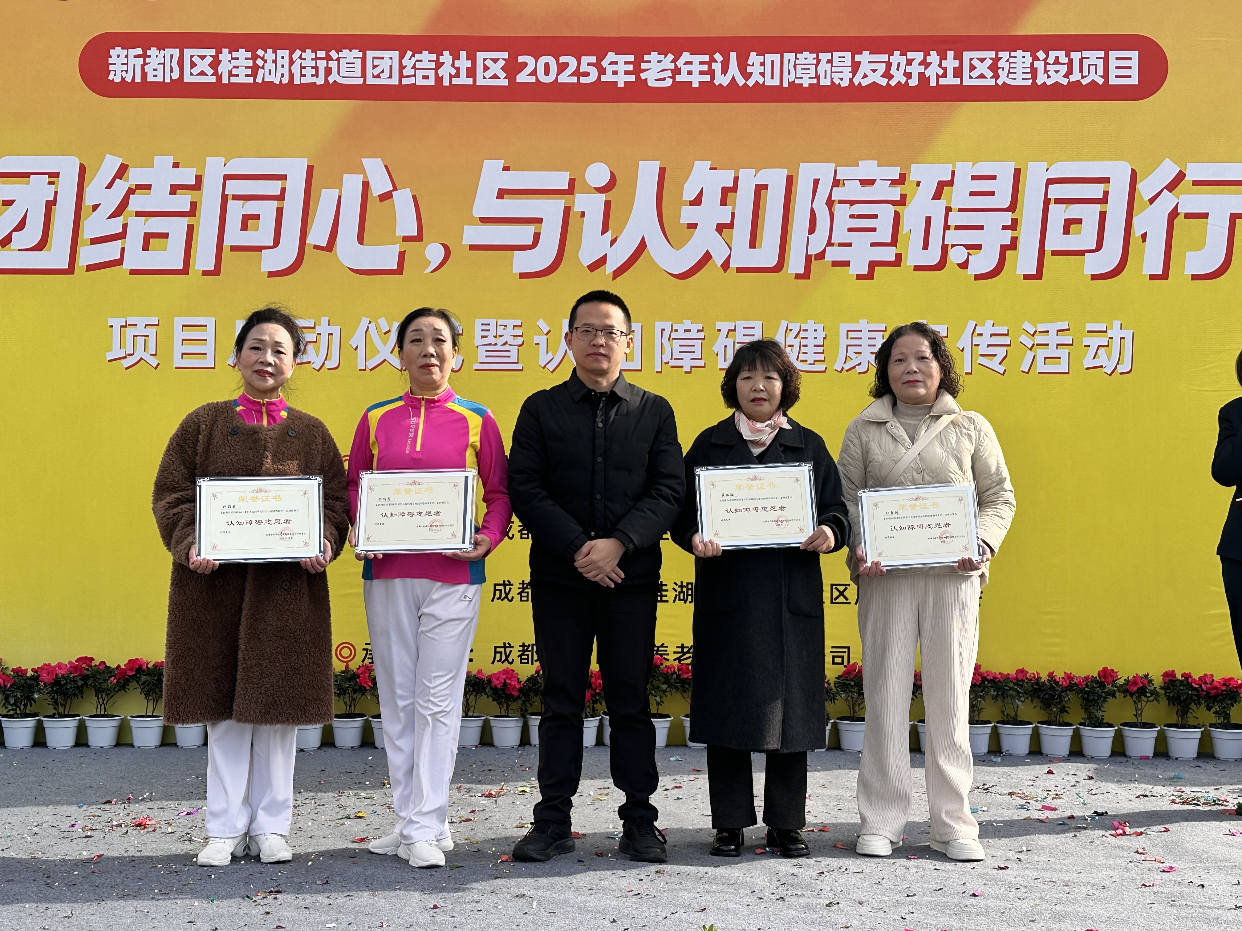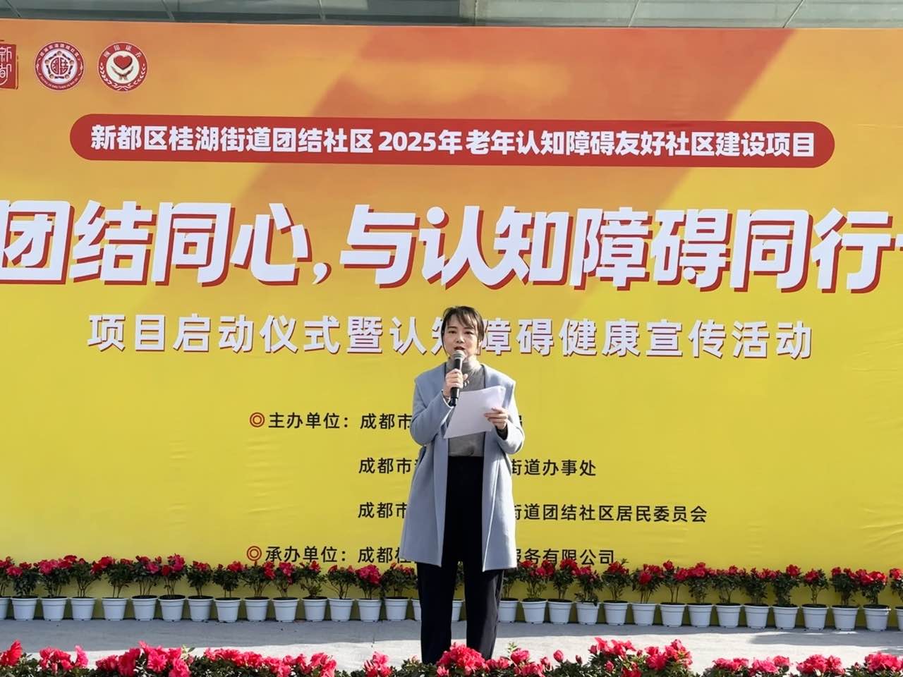 2025年11月19日上午,由新都区民政局、桂湖街道办事处及团结社区居民委员会联合主办,成都桂团颐锦养老服务有限公司承办的“团结同心,与认知障碍同行”项目启动仪式暨健康宣传活动在百郦中心顺利举行。