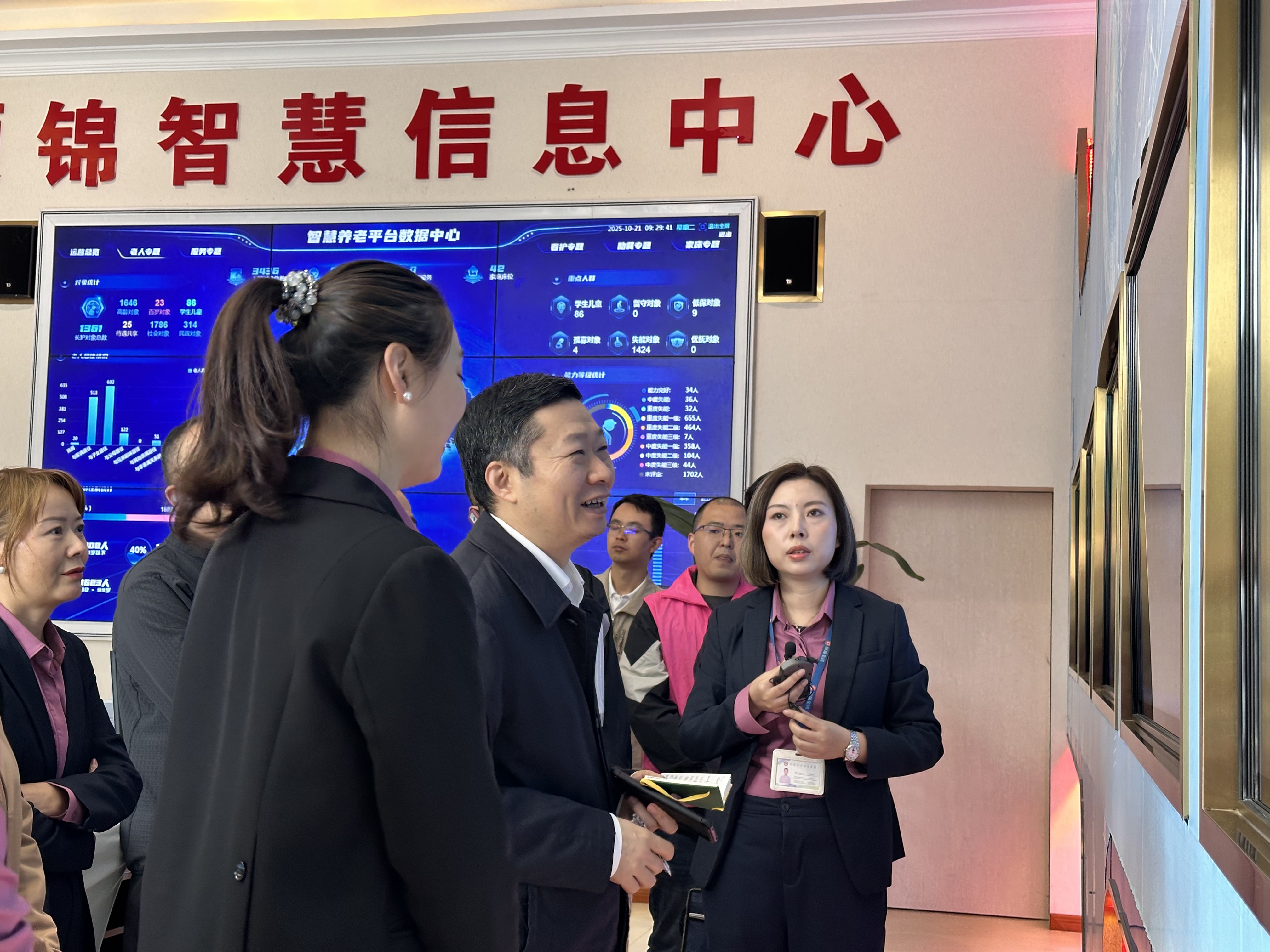 走进智慧化信息大厅,调研组查看了虹满天使用的智慧化管理平台。该平台集机构照护与居家服务管理于一体,实现了全流程数字化运行,有效支撑了服务规范与效率提升。