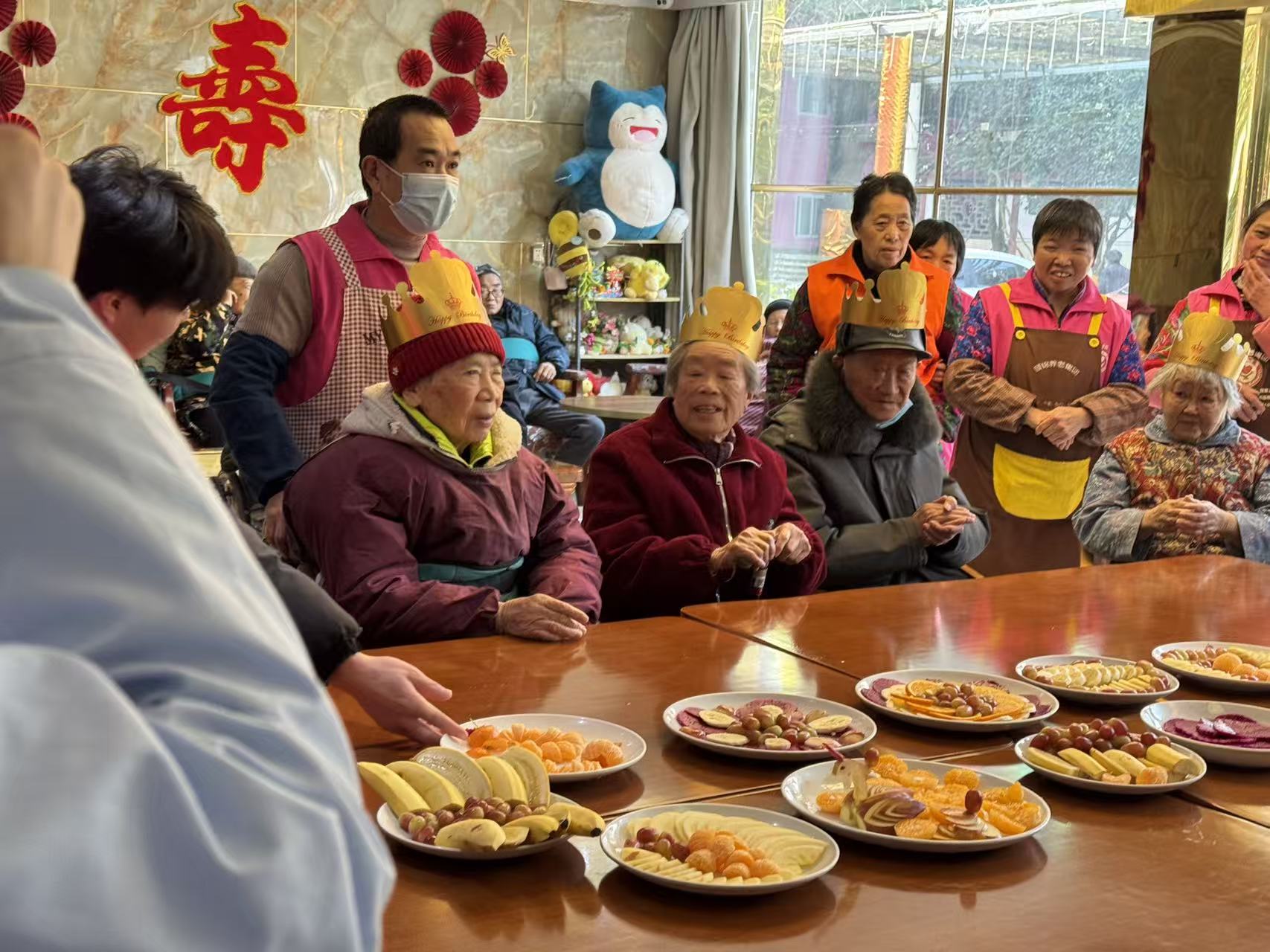 分享蛋糕之后,茶话会在一片温馨中展开。长辈们品着甜糯的蛋糕与清香的茶水,闲聊生活趣事,回忆往昔岁月。