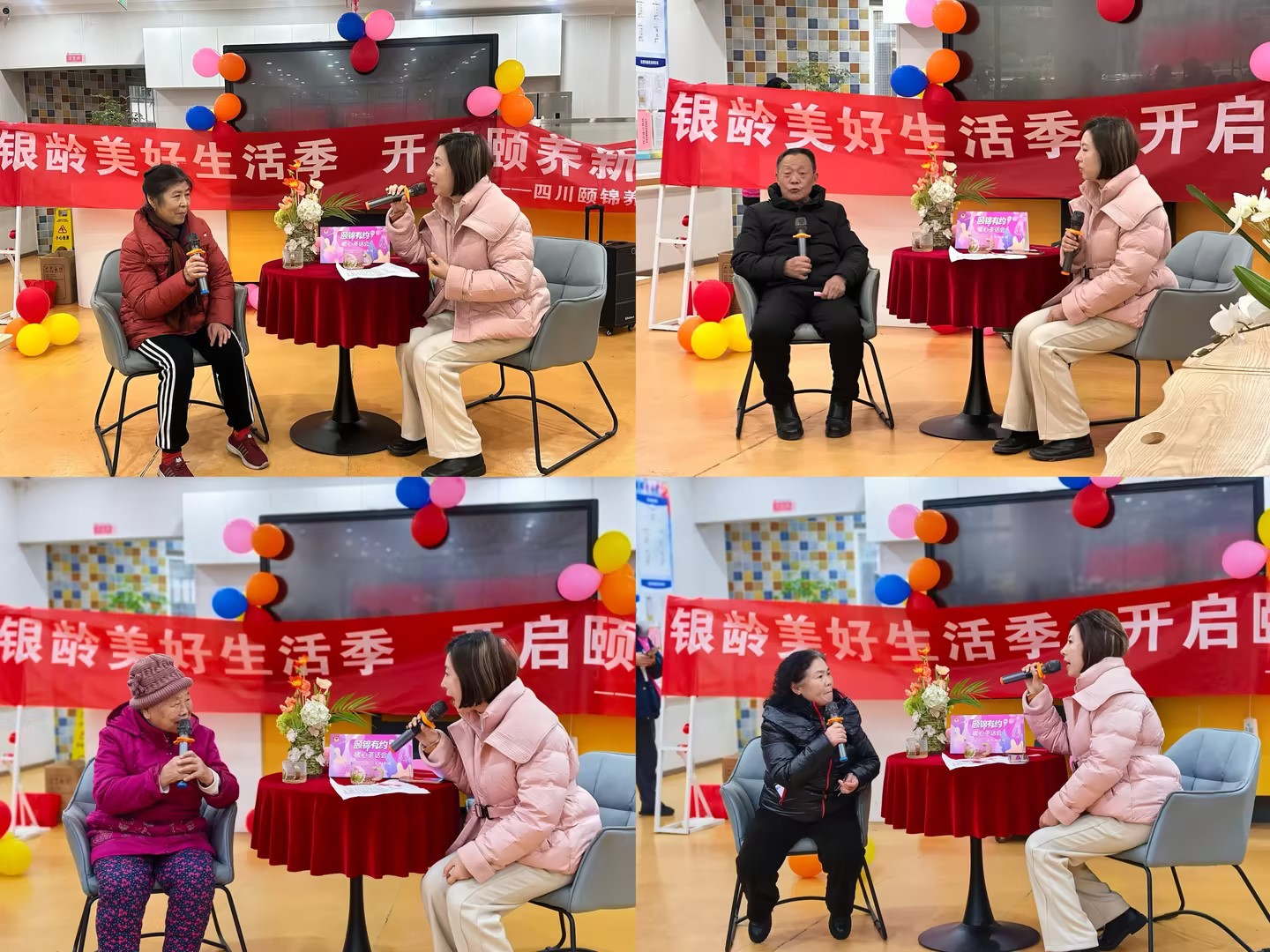 游戏结束后,茶话会核心的访谈分享环节温馨开启。主持人先后邀请6位长辈上台交流,大家敞开心扉,分享生活趣事与岁月感悟。真挚的话语、朴实的情感打动全场,台下长辈认真倾听、不时回应,温馨氛围愈发浓厚。